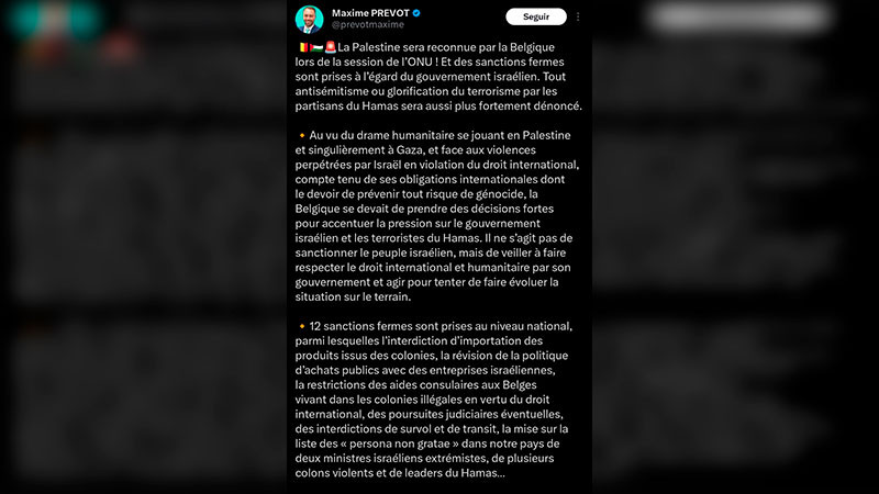 Bélgica reconocerá al Estado palestino e impondrá sanciones contra el gobierno de Israel en la Asamblea General de la ONU en septiembre